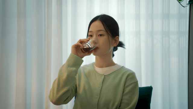 Woman drinking beverage in living room