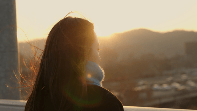 Profile of a woman watching the sunset by the river