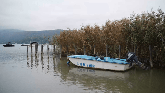 Dcked small boats on a calm Baegunhosu Lake on a sunny day