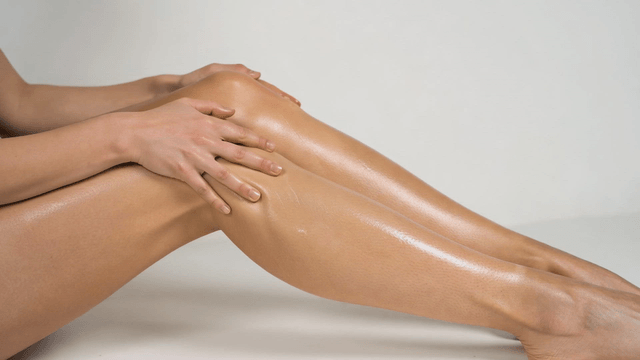 Hands applying lotion to smooth legs