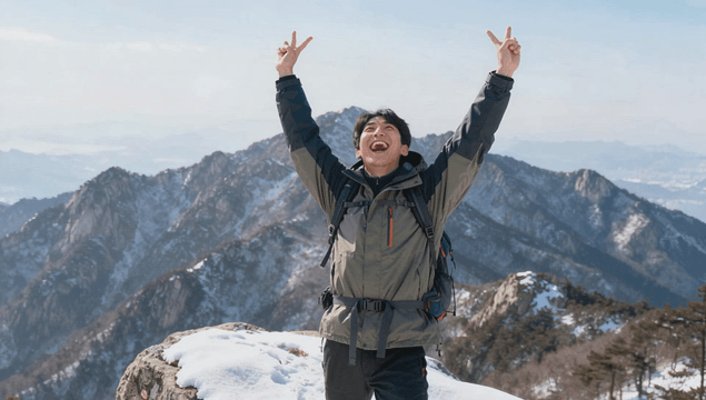 Woman drinking from thermos next to snow-covered mountain path signpost