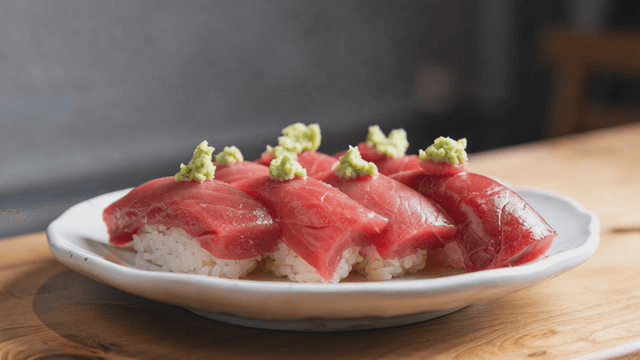 Lifting Tuna Sashimi Topped with Wasabi Using Chopsticks