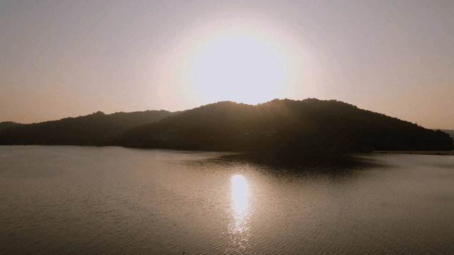 Sunset over a tranquil lake and hills