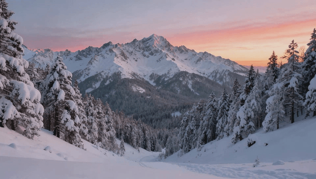 Snow-covered mountains and forests