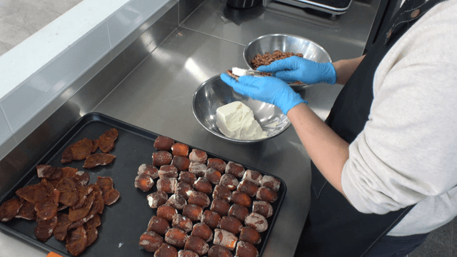 Person who puts walnuts and cream cheese in dried persimmons