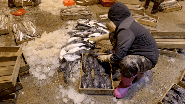 Workers sorting fish in a busy market