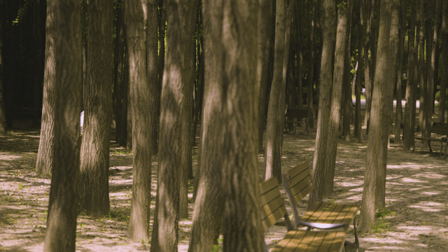 Quiet forest path with benches