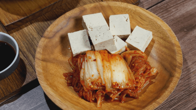 Grilled tofu and kimchi with large-eyed herring on a plate