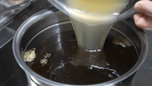 Broth poured into large cauldron