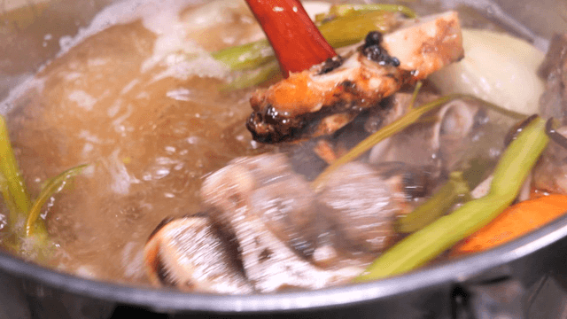 Broth of boiling stew made with sundae, mushrooms, and vegetables