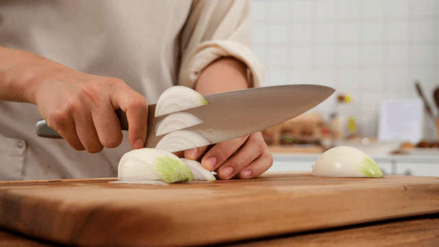 Slicing onions with a knife on a cutting board