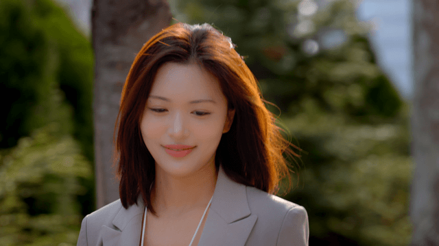 Back view of female office worker walking toward Hyundai Building