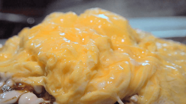 Hot okonomiyaki topped with egg omelet, sauce, and mayonnaise