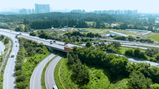 Baegunhosu Lake with a view of the busy highway and cityscape