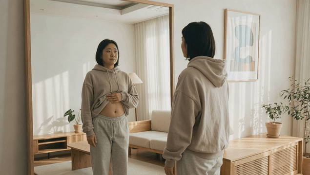 Obese woman sitting in front of mirror in her room and touching her stomach