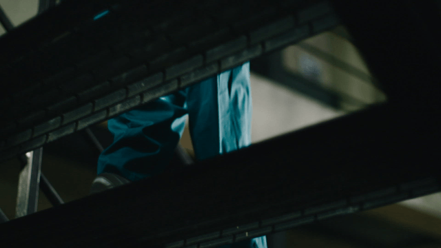Prisoner holding piece of plastic-wrapped bread beyond bars.