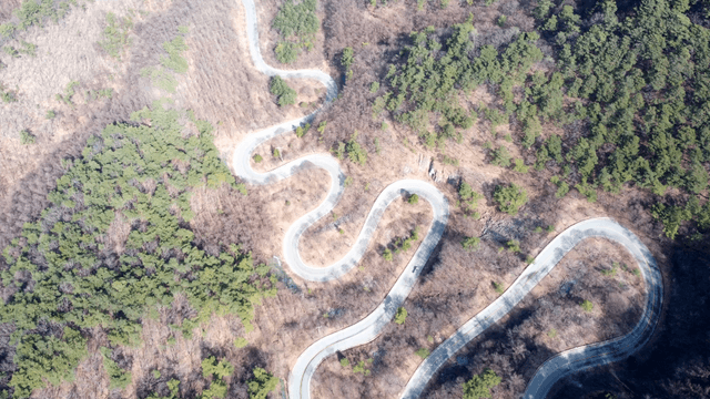 Winding road cutting through forest