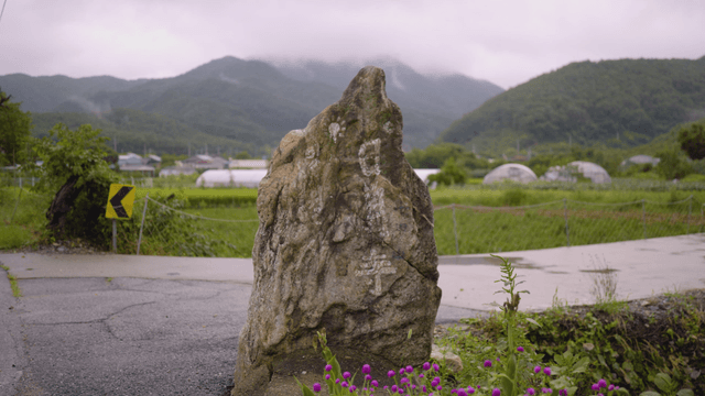 A rural farm landscape with mountains