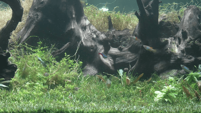 Colorful fish swimming in a planted aquarium