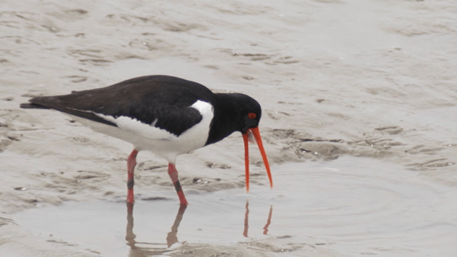 Bird foraging with its beak on the muddy tidal shore