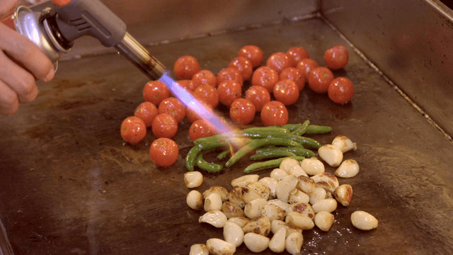 Torch flame grilling garlic, green beans, and cherry tomatoes on griddle