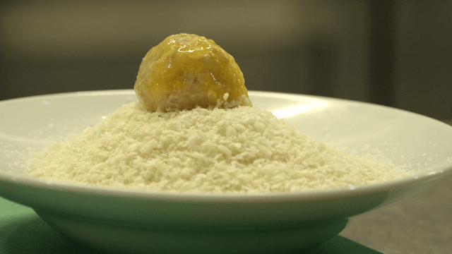 Chef preparing breaded balls on a plate