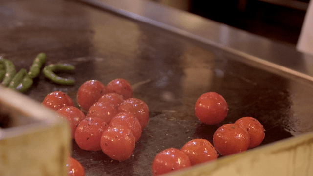 Torch flame grilling garlic, green beans, and cherry tomatoes on griddle