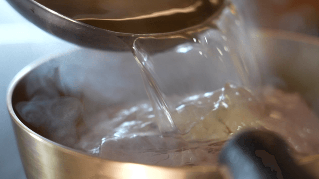 Spicy broth being poured over noodles