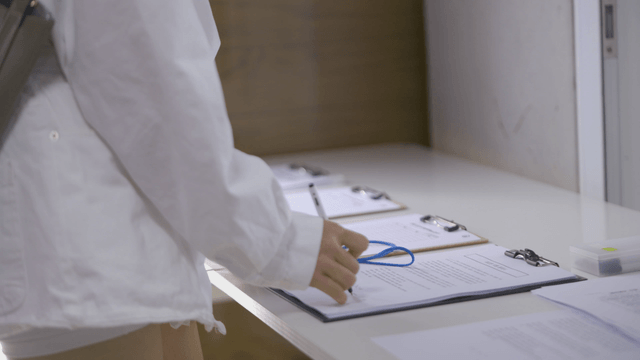 Person handling documents at a counter