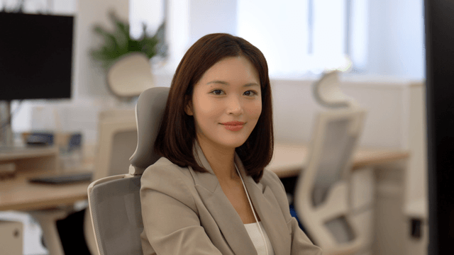 An office worker smiling in an office