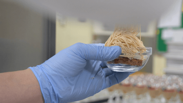 Gloved hands holding a cream-filled pastry