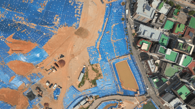 Construction site with blue tarps and hills