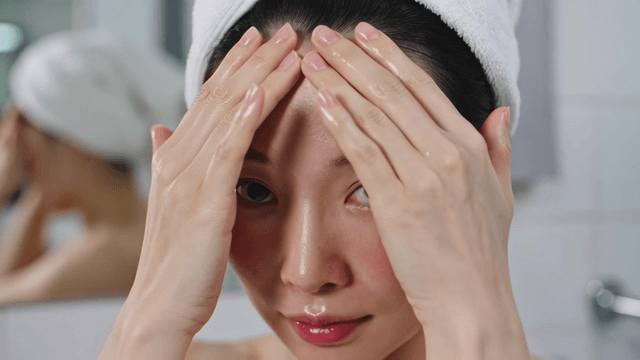 Woman gently drying her face with a towel in front of a bathroom mirror