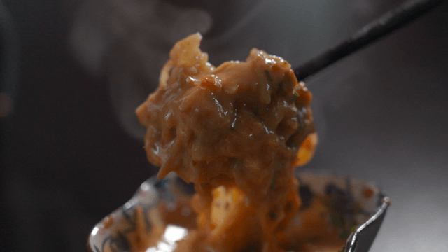 Raw beef being dipped in spicy sauce