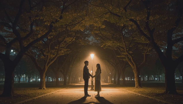 Couple holding hands under a streetlight