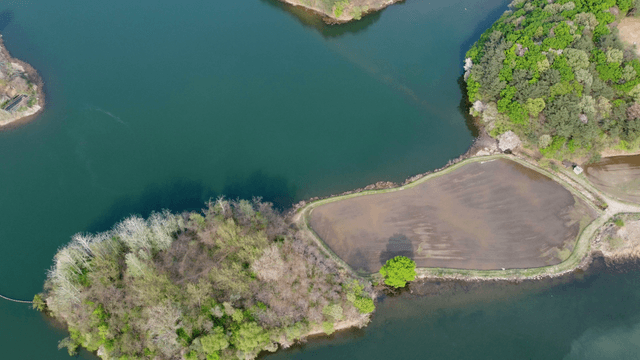 Aerial view of lake with forested island