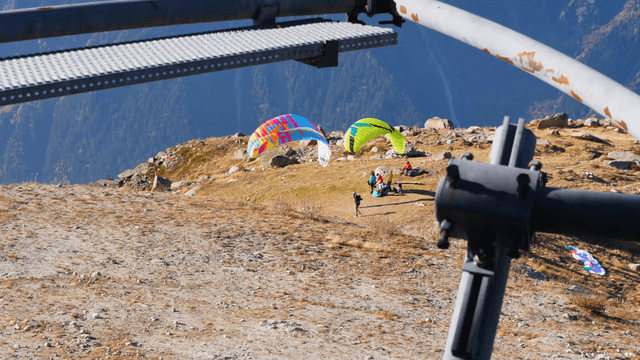 People preparing for paragliding on mountain peak