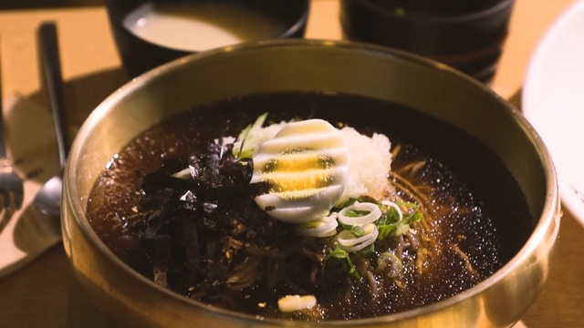 A bowl of spicy Korean Cold Buckwheat Noodles