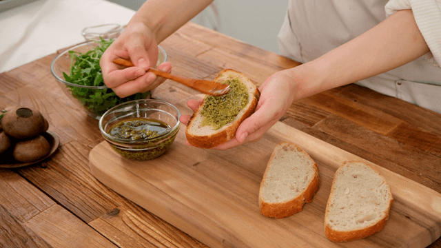 Spreading basil pesto between bread