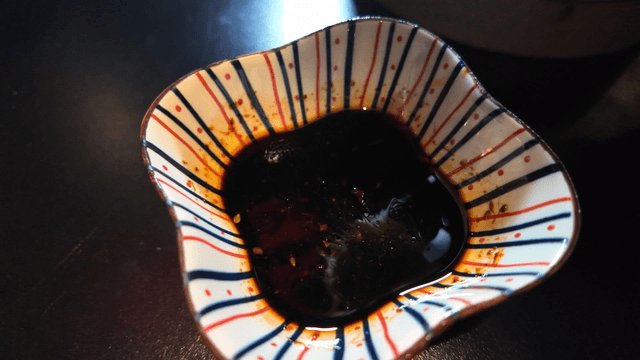 Pancake made of skate dipped in soy sauce