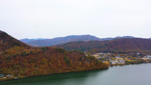Baegunhosu Lake with a view of mountains and trees colored in autumn leaves and walking paths