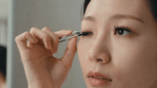 Woman carefully applying mascara to her lashes with a mirror indoors