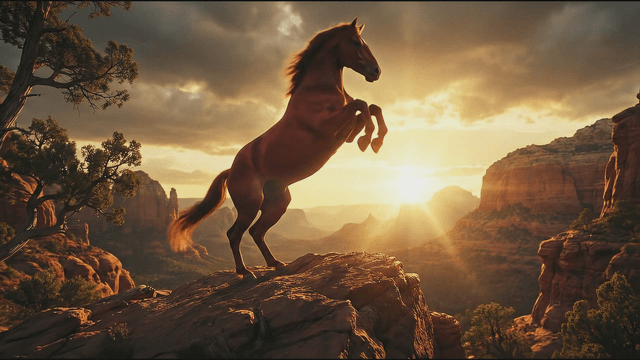 Red horse running across desert cliff landscape