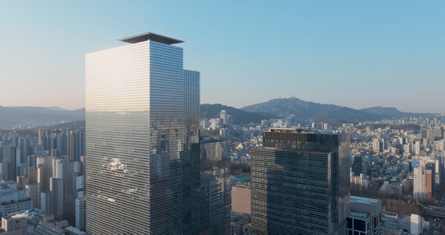 Tall skyscrapers in bustling city