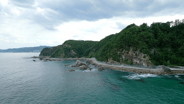 Coastal road along a lush green hillside