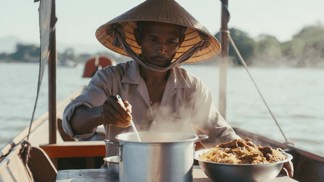 Thai street vendor putting hot noodles into bowl