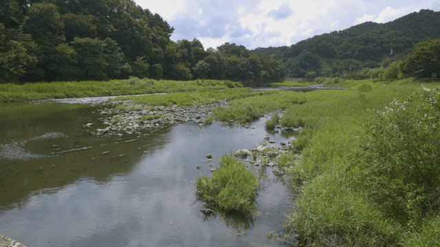Tranquil river flowing through green vegetation