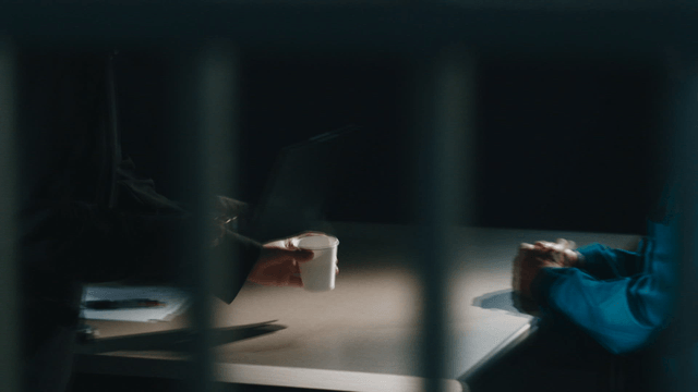 Prisoner being questioned in interrogation room beyond bars