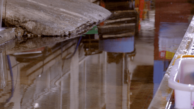 Merchant Walking on the Floor of a Fish Market Splashed with Sea Water