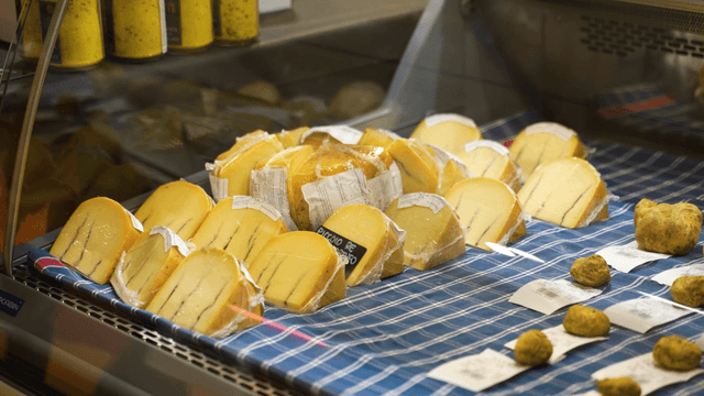 Cheese display at a market stall